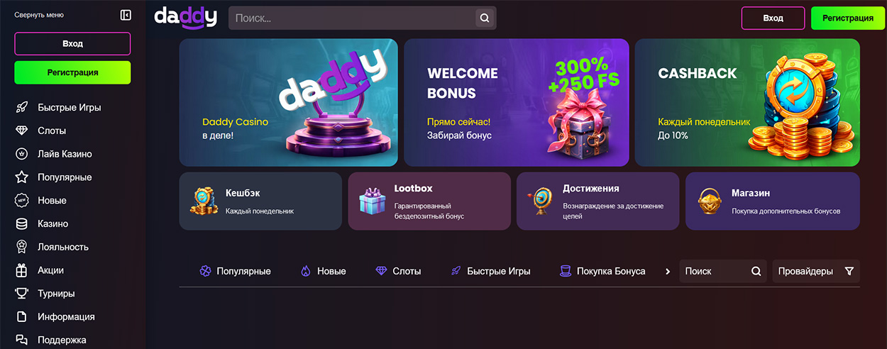 Официальный сайт Daddy Casino известен своей щедрой бонусной политикой, предлагая разнообразные возможности для увеличения игрового опыта и шансов на выигрыш.